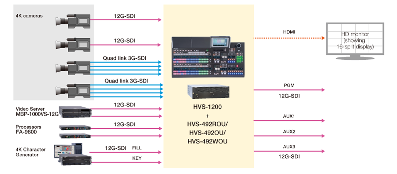 主机支持12G-SDI 10 输入,HD-SDI 40 输入,可方便的在4K (UHD) 格式和HD 格式之间灵活切换。可兼顾4K制作和HD 制作需求。