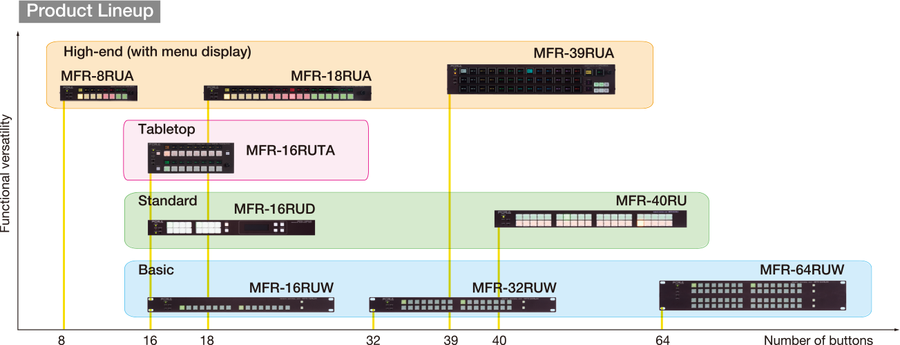 根据您的需求,我们提供了多种不同的操作面板可供选择,最多可连接127个单元。这使您可以通过划分矩阵层级的方式构建灵活的操作环境,详细信息请参阅MFR-RU系列页面。